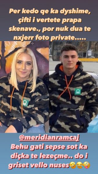 “Për këdo që ka dyshime çifti i vërtetë prapa skenave, por nuk dua të nxjerr foto private”, tutje Shqipja shton se sonte do publikoi diçka që sipas saj ia vlen pritja.