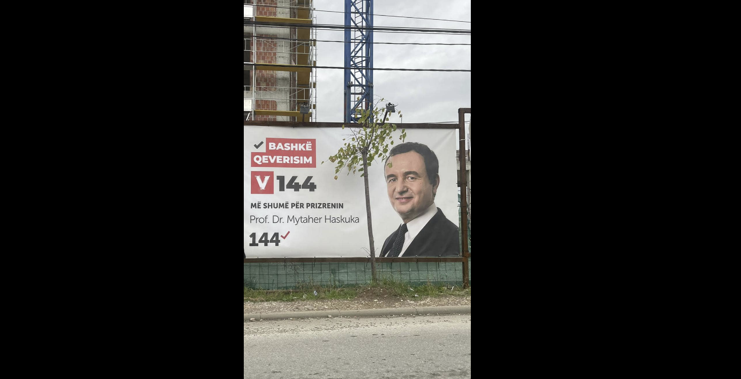 “Më shumë për Prizrenin! Prof. Dr. Mytaher Haskuka” – shkruhet në një poster, por problemi është se aty nuk shfaqet Haskuka, kryetari aktual i Prizrenit, por Albin Kurti.