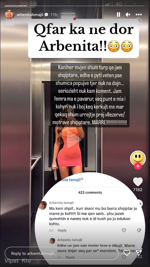 “Nganjëherë më vjen shumë turp që jam shqiptare, edhe e pyeti veten përse shumica e popujve tjerë nuk na duan. Seriozisht nuk kam koment. Jam femra më e pavarur, veç punët e mia i shikoj, nuk i bëj keq askujt me marrë kaq shumë urrejtje prej vëllezërve/motrave shqiptare. Marre. Ma keni shpifur, kurrë nuk do të bëheni burra shqiptarë ju, marre ju qoftë. Si me qenë serbë, nuk e di kush po ju edukon kështu. Edhe unë jam nënë motër, teze e dikujt, Marrë more tmerr vetëm për marrëdhënie intime mendoni. Të degjeneruar.”, ka shkruar ajo.