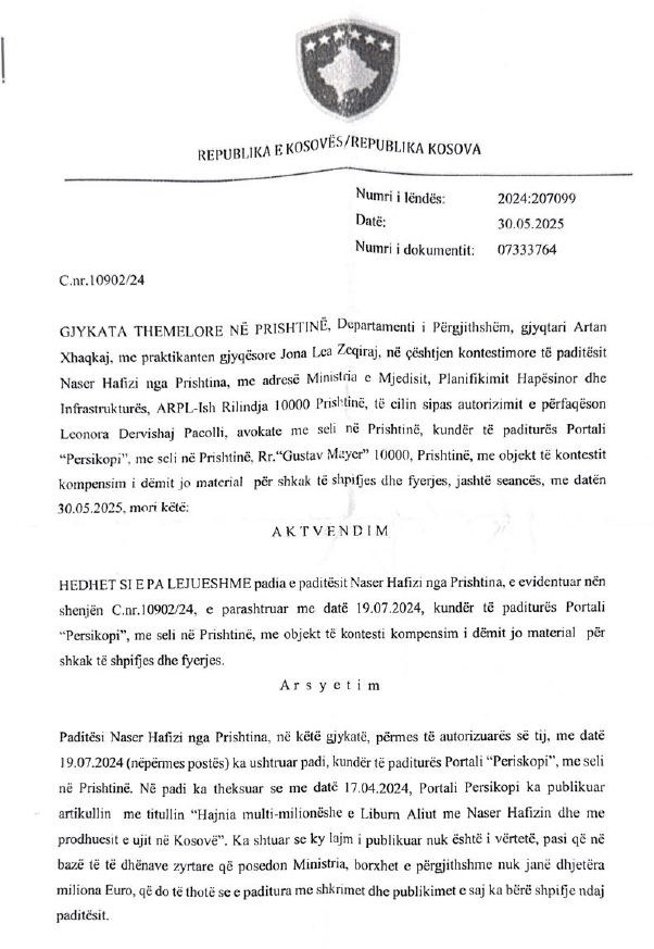 Gjykata Themelore në Prishtinë e ka hedhur poshtë si të palejueshme padinë e Naser Hafizit ndaj Periskopit, lidhur me publikimin e artikullit “Hajnia multi-milionëshe e Liburn Aliut me Naser Hafizin dhe me prodhuesit e ujit në Kosovë”.