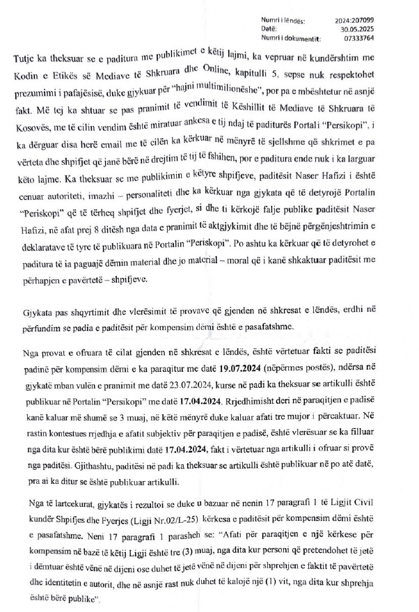 Naser Hafizi më datë 19.07.2024 ka parashtruar padi ndaj Periskopit me “arsyetimin për shpifje dhe fyerje”.