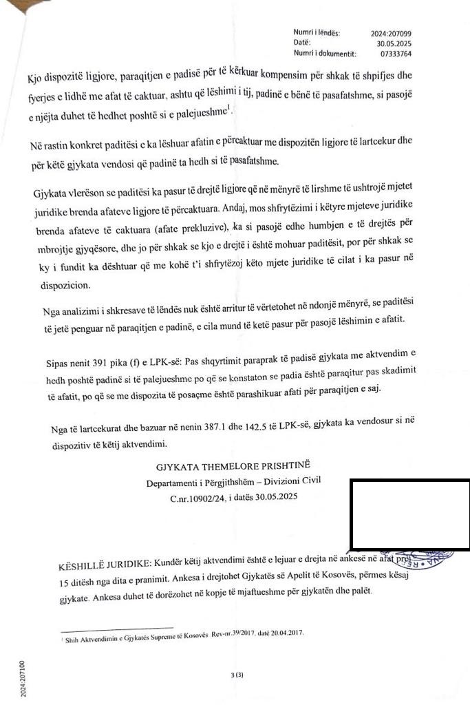 “Gjykata pas shqyrtimit dhe vlerësimit të provave që gjenden në shkresat e lëndës, erdhi në përfundim se padia e paditësit për kompensim dëmi është e pasafatshme”, thuhet në aktvendimin e Gjykatës.