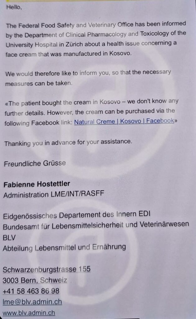 “Zyra Federale për Sigurinë Ushqimore dhe Veterinare është informuar nga departamenti i farmakologjisë klinike dhe toksikologjisë në Spitalin Universitar në Cyrih për një problem shëndetësor që ka të bëjë me kremin e fytyrës që është prodhuar në Kosovë. Prandaj dëshirojmë t’ju informojmë që të merren masat e nevojshme. Pacienti e ka blerë kremin në Kosovë – nuk dimë detaje të tjera. Megjithatë, kremi mund të blihet në lidhjen e mëposhtme në Facebook: Krem natyral-Kosova-Facebook”, thuhet në shkresën zyrtare të Zvicrës që e ka siguruar Periskopi.