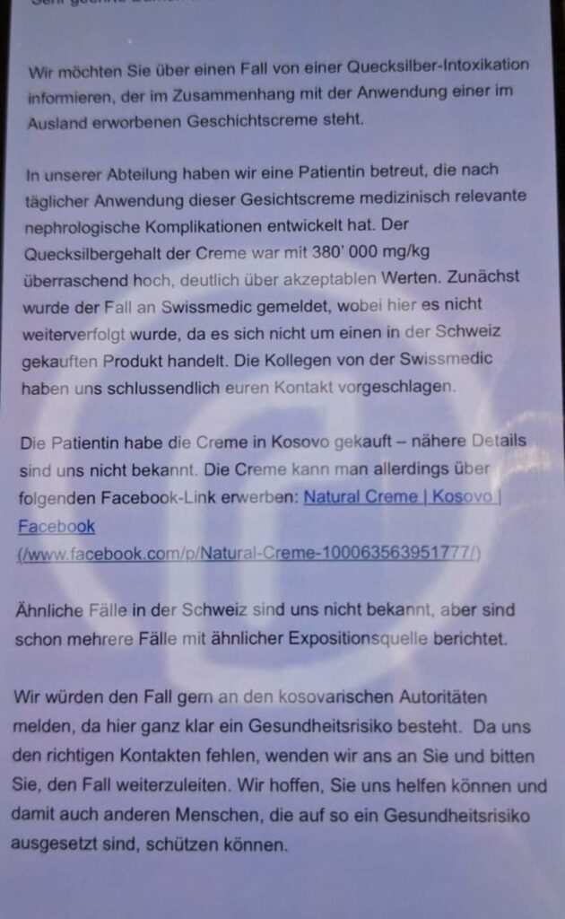 “Dëshirojmë t’ju informojmë mbi një rast të helmimit nga mërkuri, i cili lidhet me përdorimin e një kremi fytyre të blerë jashtë vendit. Në repartin tonë kemi trajtuar një paciente, e cila pas përdorimit të përditshëm të këtij kremi fytyre ka zhvilluar komplikime nefrologjike mjeksore. Përmbajtja e merkurit në këtë krem ishte jashtëzakonisht e lartë, me 380,000 mg/kg, shumë mbi vlerat e pranueshme. Fillimisht, rasti u raportua te Swissmedic, por nuk u ndoq më tej, pasi nuk bëhej fjalë për një produkt të blerë në Zvicër. Përfundimisht, kolegët e Swissmedic na sugjeruan të iu kontaktonim. Pacientja e kishte blerë kremin në Kosovë – detajet e tjera nuk i kemi të njohura. Sidoqoftë, këtë krem mund ta gjeni përmes lidhjes së mëposhtme në Facebook: Natural Creme Kosovo Facebook”, thuhet në shkresën që e ka siguruar Periskopi.