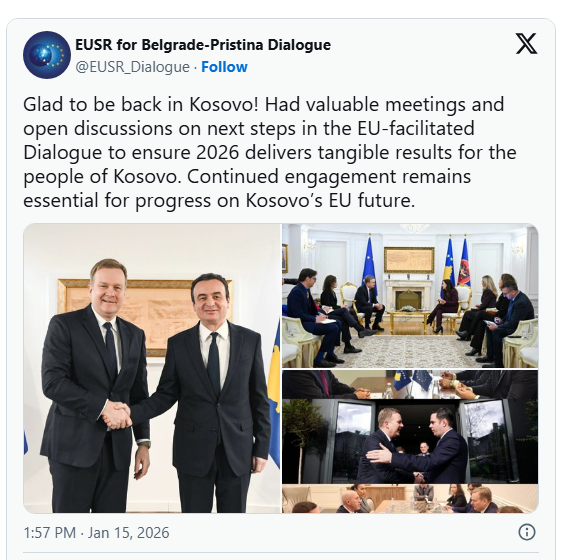 “I lumtur që jam kthyer në Kosovë! Pata takime të vlefshme dhe diskutime të hapura mbi hapat e mëtejshëm në dialogun e lehtësuar nga BE-ja për të siguruar që viti 2026 të sjellë rezultate të prekshme për popullin e Kosovës”, ka shkruar ai në X.
