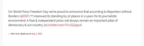“Në Ditën Botërore të Lirisë së Shtypit, ne jemi krenarë të njoftojmë se sipas Reporterëve pa Kufij, Kosova përmirësoi pozicionin e saj me 22 vende në 2 vjet për mjedisin e saj gazetaresk. Një shtyp i lirë dhe i pavarur do të mbetet gjithmonë një shtyllë e rëndësishme e demokracisë dhe e vendit tonë”, kishte shkruar Kurti në vitin 2023.