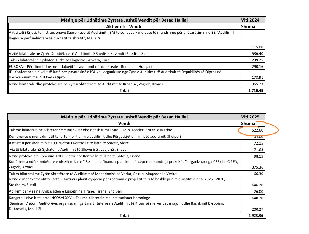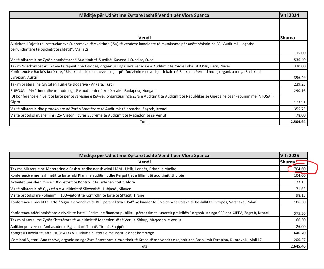 Sipas përgjigjes zyrtare, Auditorja e Përgjithshme, Vlora Spanca, ka shpenzuar për mëditje jashtë vendit 2,505 euro gjatë vitit 2024, ndërsa 2,645 euro gjatë vitit 2025, apo gjithsej 5,150 euro për dy vite.