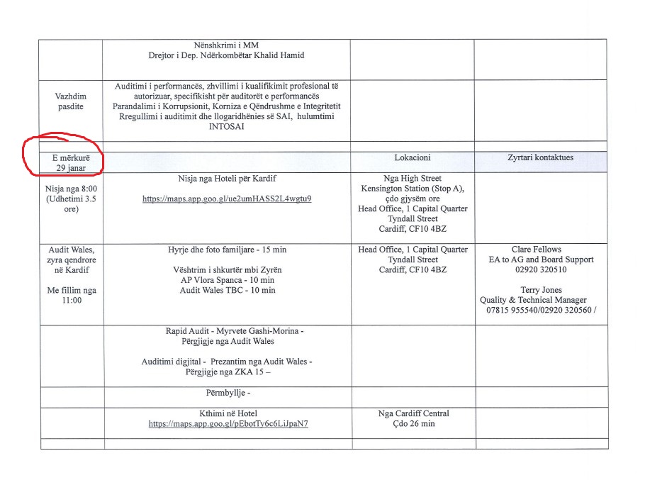 Në agjendën e datës 1 shkurt, për Auditoren e Përgjithshme nuk figuron asnjë aktivitet zyrtar. Ndërsa më 2 shkurt, ajo ka shënuar një intervistë për mediumin “ALB UK TV”, aktivitet që nuk ka qenë pjesë e takimeve institucionale dhe që vjen pas përfundimit zyrtar të vizitës, siç është deklaruar nga vetë ZKA një ditë më herët.