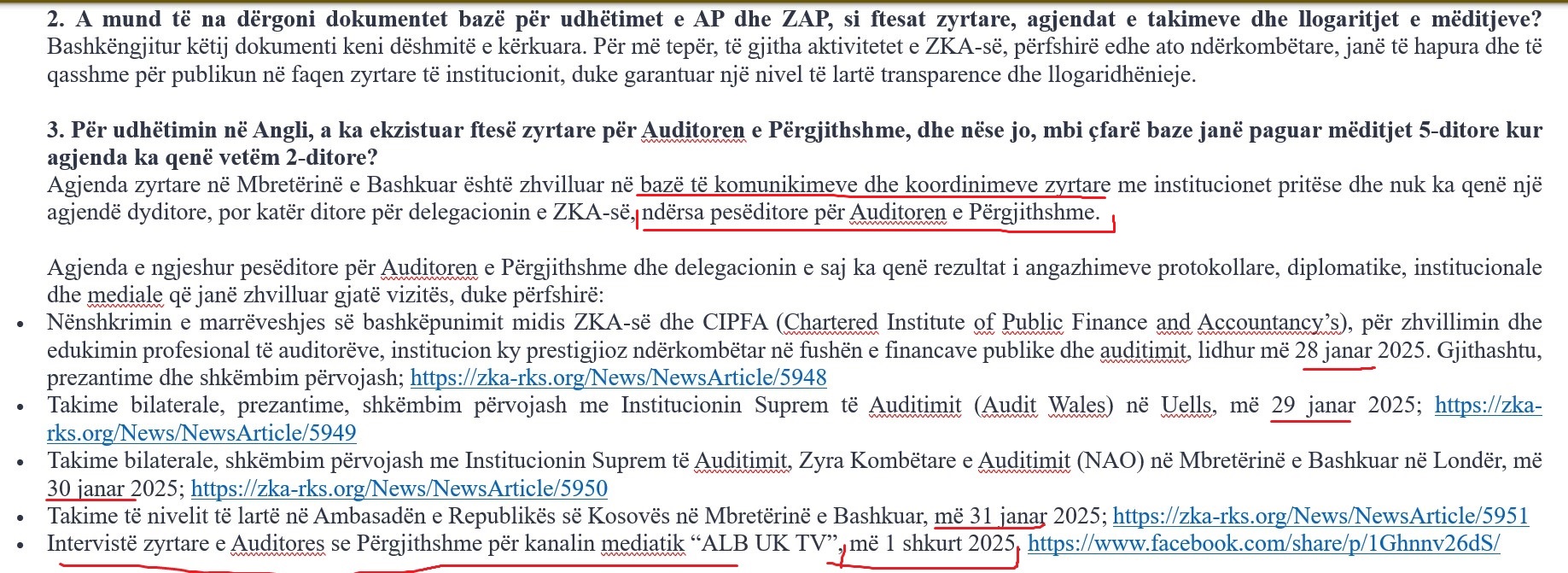 ZKA ka theksuar se të gjitha dokumentet për udhëtimet janë të bashkëngjitura dhe se aktivitetet ndërkombëtare janë publike. Megjithatë, rasti i Londrës tregon se, përkundër transparencës formale, praktika e përfitimit të mëditjeve përtej agjendës zyrtare mbetet e mjegullt, sidomos kur bëhet fjalë për drejtuesit më të lartë të institucionit që kanë për detyrë të jenë shembull i korrektësisë financiare. /Demokracia.com/