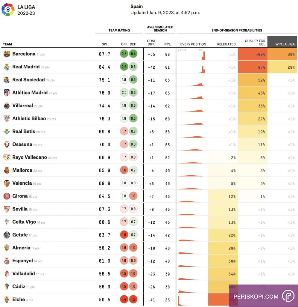 Projekti ‘FiveThirtyEight’ ka ndarë një parashikim të përditësuar të superkompjuterit për rezultatin e La Ligës.