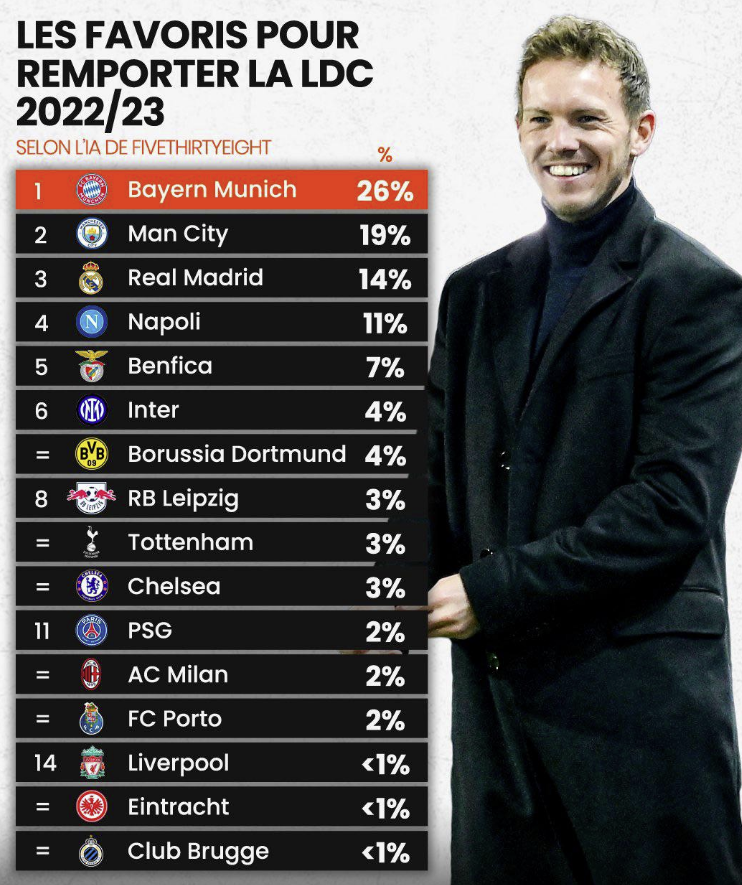 Në fakt, favoritët janë gjigantët gjermanë të Bundesligës, Bayern Munich, i cili fitoi Ligën e Kampionëve në vitin 2020. Skuadrës së Julian Nagelsmann-it i është dhënë një shans 26% për të fituar edicionin e këtij sezoni.