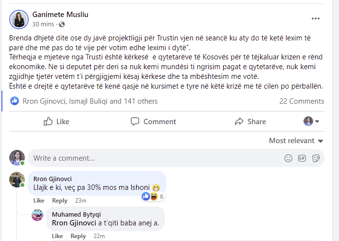 Llajku i Rron Gjinovcit dhe komenti i tij te një status i deputetes Ganimete Musliu, ka marrë reagime.