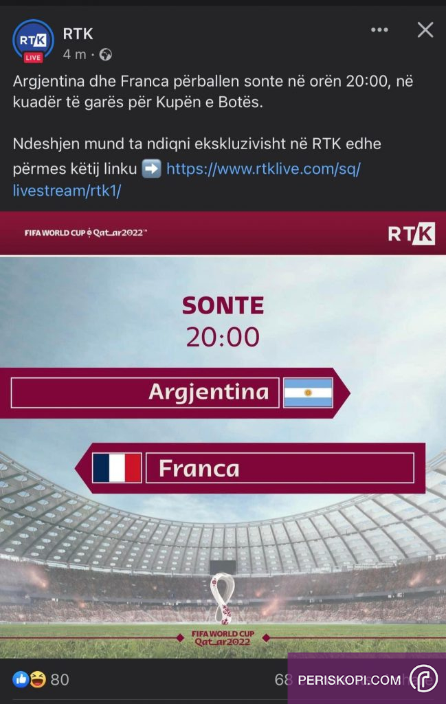Radio Televizioni i Kosovës në paralajmërimin e ndeshjes mes Argjentinës dhe Kroacisë ka ngatërruar skuadrën kroate me kombëtaren franceze.