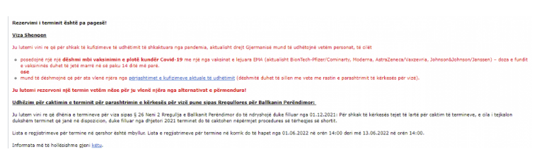 “Ju lutem vini re që dhënia e termineve për viza sipas § 26 Neni 2 Rregullja e Ballkanit Perëndimor do të ndryshojë duke filluar nga 01.12.2021: Për shkak të kërkesës tejet të lartë për caktim të termineve, e cila i tejkalon dukshëm terminet që janë në dispozicion, duke filluar nga dhjetori 2021 terminet do të caktohen nëpërmjet procedures së tërheqjes së shortit.