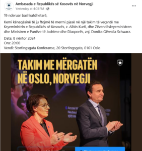 Njoftimi për takim me mërgimtarët u bë në faqen zyrtare të ambasadës së Kosovës në Oslo, duke dhënë detaje datën, orën dhe vendin e takimit.