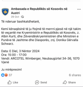 “Të nderuar bashkatdhetarë, kemi kënaqësinë të ju ftojmë të merrni pjesë në një takim të veçantë me Kryeministrin e Republikës së Kosovës, z. Albin Kurti, dhe Zëvendëskryeministren dhe Ministren e Punëve të Jashtme dhe Diasporës, znj. Donika Gërvalla Schwarz.