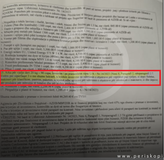 Në dokumentin më poshtë mund të shihni projektin e znj. Ismaili ku në listën e investimeve figuron “Arka për vjelje…”, por AZHB nuk e pranoi, pasi sipas Udhëzimit Administrativ, ky investim vlen vetëm për sipërfaqet 3 e më shumë hektarë.