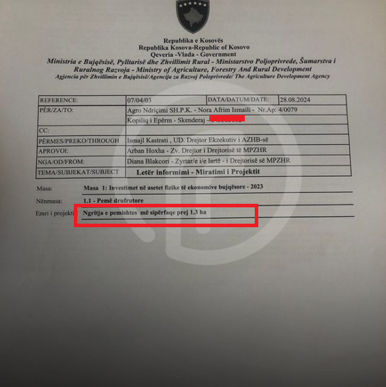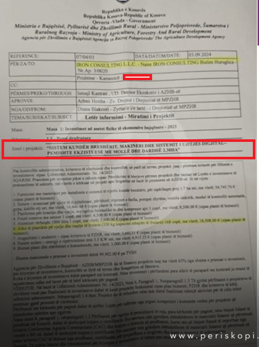 Ndërsa në dokumentin tjetër, atë të projektit të Naim Huruglicës, pavarësisht që as ky nuk i ka pasur 3 apo më shumë hektarë, të njëjtit i pranohet ky investim i cili kushton afro 19 mijë euro.