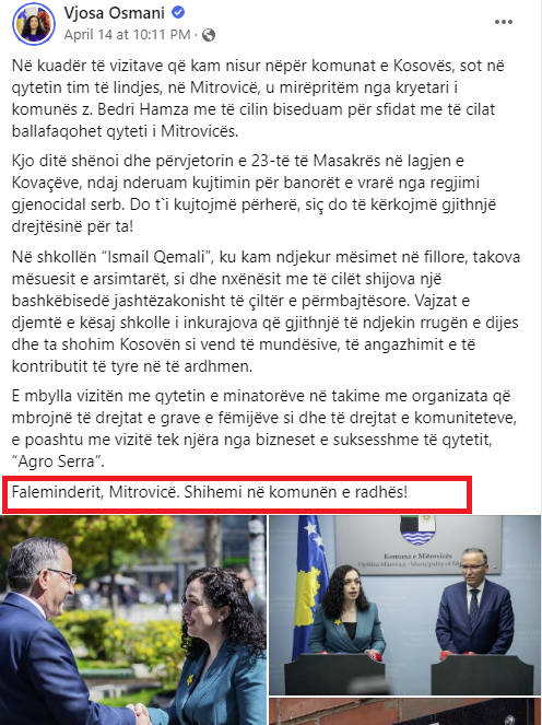 “Faleminderit, Mitrovicë. Shihemi në komunën e radhës!”. Kështu shkroi presidentja Vjosa Osmani, në një prej vizitave në komunën e Mitrovicës, bërë më 14 prill 2022.