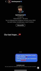 “Të lutem Lamine Yamal, mos shëno ndaj Shqipërisë. Do të ndihmoj me detyrat e shtëpisë. Faleminderit”, ishte shkrimi i tij drejtuar 16- vjeçarit.
