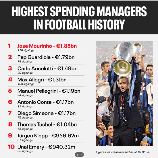 I pari është trajneri i Romës, Jose Mourinho që ka shpenzuar 1.85 miliard euro në 116 transferime.
