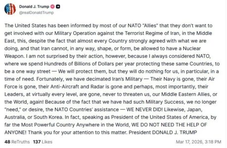 Donald Trump tha se ShBA-të janë informuar “nga shumica e ‘aleatëve’ tanë të NATO-s se nuk duan të përfshihen” në luftën e Iranit.