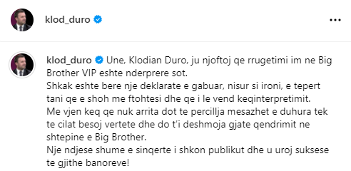 “Une, Klodian Duro, ju njoftoj qe rrugetimi im ne Big Brother VIP eshte nderprere sot.