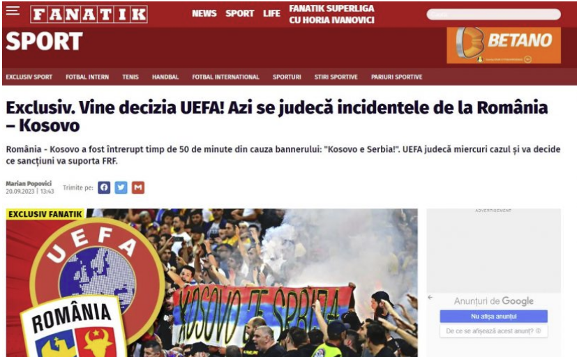 Për këtë arsye, gazeta rumune “Fanatik” mëson se UEFA do të vendosë sot se çfarë dënimi do t’ia japë Federatës Rumune të Futbollit, përcjell “Gazeta Express”.