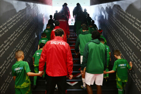 TIRANA, ALBANIA – MAY 19: Players of both side’s make their way out the tunnel prior to the UEFA European Under-17 Championship 2024/25 Group A match between Albania and Portugal at Arena Kombetare on May 19, 2025 in Tirana, Albania. (Photo by Ben McShane – Sportsfile/UEFA via Getty Images)