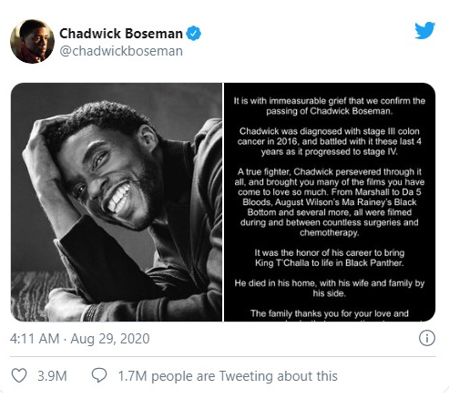 “Një luftëtar i vërtetë, Chadwick këmbënguli gjatë gjithë kësaj dhe ju solli kaq shumë nga filmat të cilët i keni dashur aq shumë”, thuhet në deklaratë.