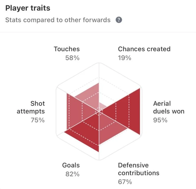 Shifrat e tij tregojnë qartë forcën: 154 duele të fituara me sukses 53.3%, 101 duele ajrore me sukses 56.1%, 106 prekje në zonën kundërshtare, 39 faulle të fituara dhe vetëm 25 herë i zhveshur nga topi.