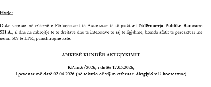 Pavarësisht këtyre argumenteve të detajuara, ankesa e paraqitur nuk ka arritur të ndryshojë rezultatin në këtë fazë të procedurës. Gjykata ka refuzuar pretendimet dhe ka lënë në fuqi aktgjykimin që obligon Ndërmarrjen Publike Banesore të paguajë shumën milionëshe ndaj , “MADE GROUP CONSTRUCTION” SH.P.K., “ARKOS” SH.P.K., dhe MADEKOS” SH.P.K,./Periskopi/