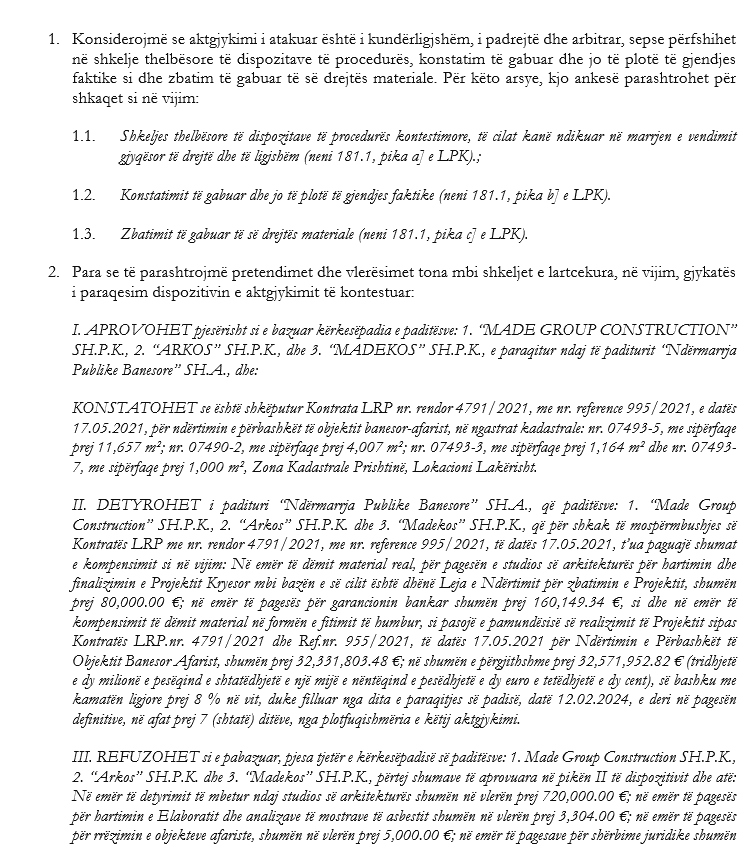 “DETYROHET i padituri “Ndërmarrja Publike Banesore” SH.A., që paditësve: 1. “Made Group Construction” SH.P.K., 2. “Arkos” SH.P.K. dhe 3. “Madekos” SH.P.K., që për shkak të mospërmbushjes së Kontratës LRP me nr. rendor 4791/2021, me nr. reference 995/2021, të datës 17.05.2021, t’ua paguajë shumat e kompensimit si në vijim: Në emër të dëmit material real, për pagesën e studios së arkitekturës për hartimin dhe finalizimin e Projektit Kryesor mbi bazën e së cilit është dhënë Leja e Ndërtimit për zbatimin e Projektit, shumën prej 80,000.00 €; në emër të pagesës për garancionin bankar shumën prej 160,149.34 €, si dhe në emër të kompensimit të dëmit material në formën e fitimit të humbur, si pasojë e pamundësisë së realizimit të Projektit sipas Kontratës LRP.nr. 4791/2021 dhe Ref.nr. 955/2021, të datës 17.05.2021 për Ndërtimin e Përbashkët të Objektit Banesor Afarist, shumën prej 32,331,803.48 €; në shumën e përgjithshme prej 32,571,952.82 € (tridhjetë e dy milionë e pesëqind e shtatëdhjetë e një mijë e nëntëqind e pesëdhjetë e dy euro e tetëdhjetë e dy cent), së bashku me kamatën ligjore prej 8 % në vit, duke filluar nga dita e paraqitjes së padisë, datë 12.02.2024, e deri në pagesën definitive, në afat prej 7 (shtatë) ditëve, nga plotfuqishmëria e këtij aktgjykimi”, thuhet në ankesë.