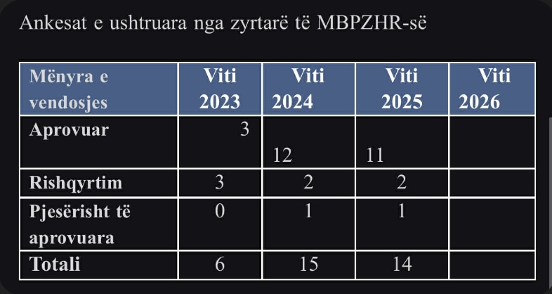 Më alarmuese është struktura e vendimeve. Në vitin 2024, nga 15 ankesa, 12 janë aprovuar dhe 1 pjesërisht e aprovuar – që do të thotë se në 13 raste është konstatuar se pretendimet e zyrtarëve kanë pasur bazë. Edhe në vitin 2025, nga 14 ankesa, 11 janë aprovuar dhe 1 pjesërisht e aprovuar. Kjo nënkupton se në shumicën dërrmuese të rasteve, vendimet apo veprimet e administratës së ministrisë janë konsideruar të padrejta ose në kundërshtim me ligjin.