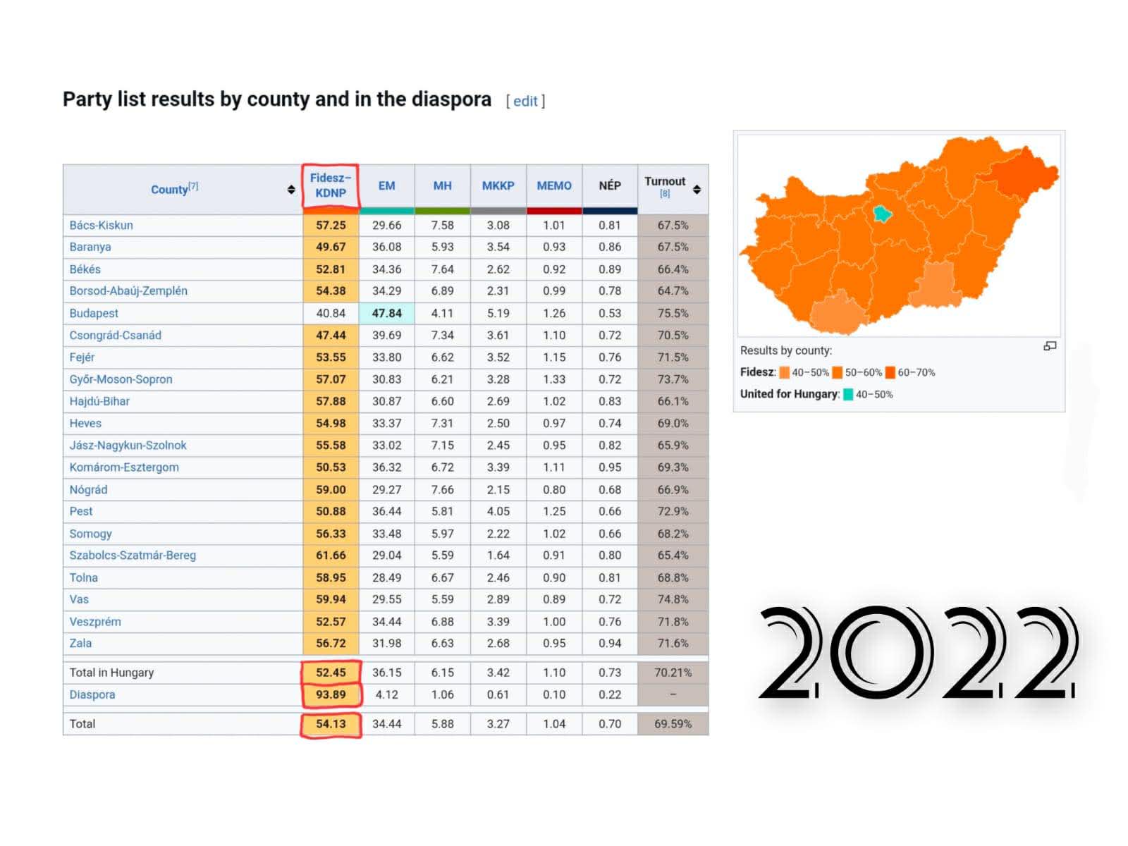 Kështu, p.sh. sipas të dhënave zyrtare, lista e përbashkët e Fidesz–KDNP në zgjedhjet e vitit 2022 kishte marrë 93.89% të votave nga diaspora, një rezultat që kishte tejkaluar rezultatin e tyre brenda territorit të Hungarisë, ku kishte siguruar rreth 52.45%.