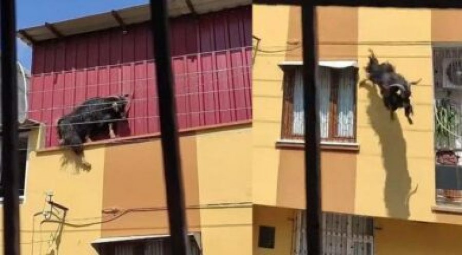 Një imazh që vjen nga Turqia dhe është publikuar në mediat sociale, shihet dhia kurban që ngjitet në çatinë e shtëpisë së veçuar 2-katëshe, ku më pas humb ekuilibrin e saj dhe bie.
