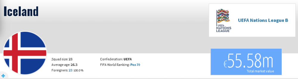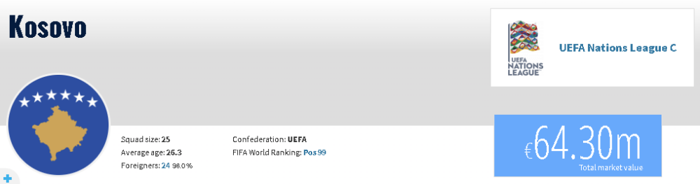 Sipas Transfermarkt, vlera e Kosovës është 64.3 milionë euro, kurse ajo e Islandës 55.58 milionë euro.