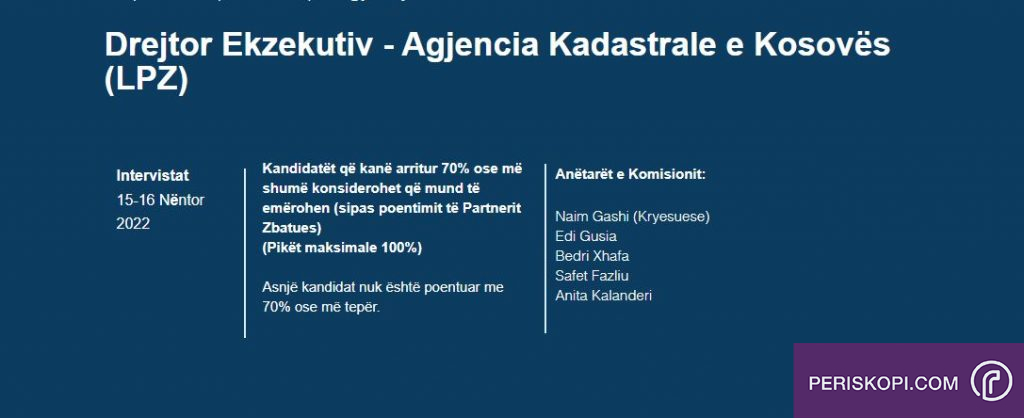 Periskopi ka mësuar se fillimisht në konkursin e Agjencisë Kadastrale të Kosovës  ishin përzgjedhur gjashtë kandidatë për intervistim me shkrim, por vetëm katër prej tyre i ishin nënshkruar një procedure të tillë, për ta vazhduar pastaj me intervistim verbal, që ngushtoi listën në tre.