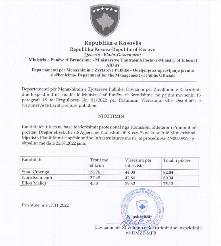 Të enjten e kësaj jave,  në uebfaqen e Agjencisë Kadastrale të Kosovës, e cila futet në dikasterin e ministrisë së Mjedisit e Planifikimit Hapësinor që udhëhiqet nga ministri Liburn Aliu, janë publikuar rezultatet nga konkursi për zgjedhjen e Drejtorit Ekzekutiv të AKK’së, ku si kandidatë me më së shumti pikë figurojnë Suad Çmega, Nora Kelmendi dhe Edon Maliqi, këta dy të fundit njerëz të partisë në pushtet.