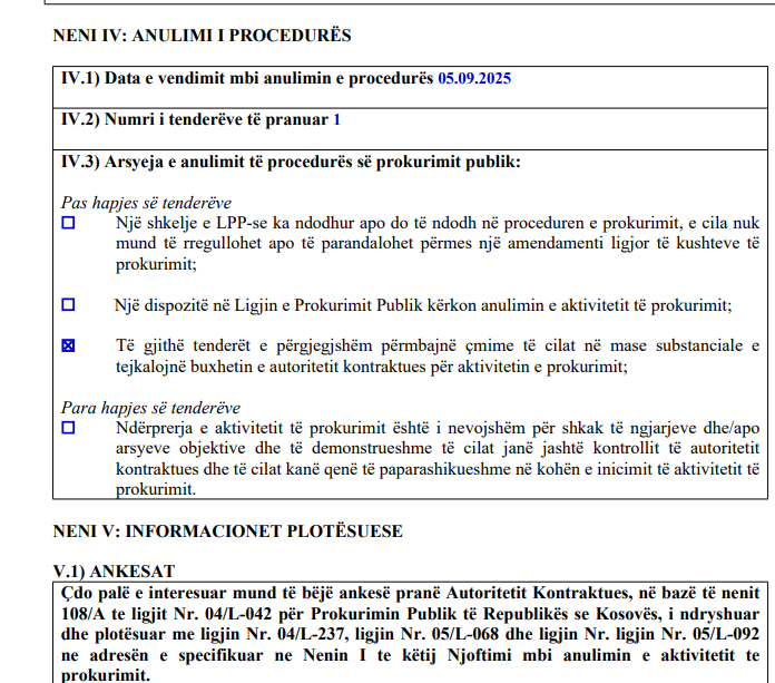 Megjithatë, një tender i tillë është anuluar, vlera e së cilës ka qenë 230,000.00 euro.