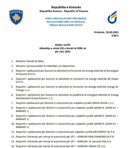 Zyra e Rregullatorit për Energji nesër do të mbajë mbledhje nga ora 09:00.