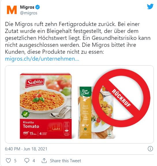 Dhjetë ushqime u tërhoqën nga raftet e rrjeteve më të mëdha të supermarketeve në Zvicër me urdhër të autoriteteve shëndetësore, arsyeja është sepse ato përmbajnë nivele tepër të larta të plumbit.