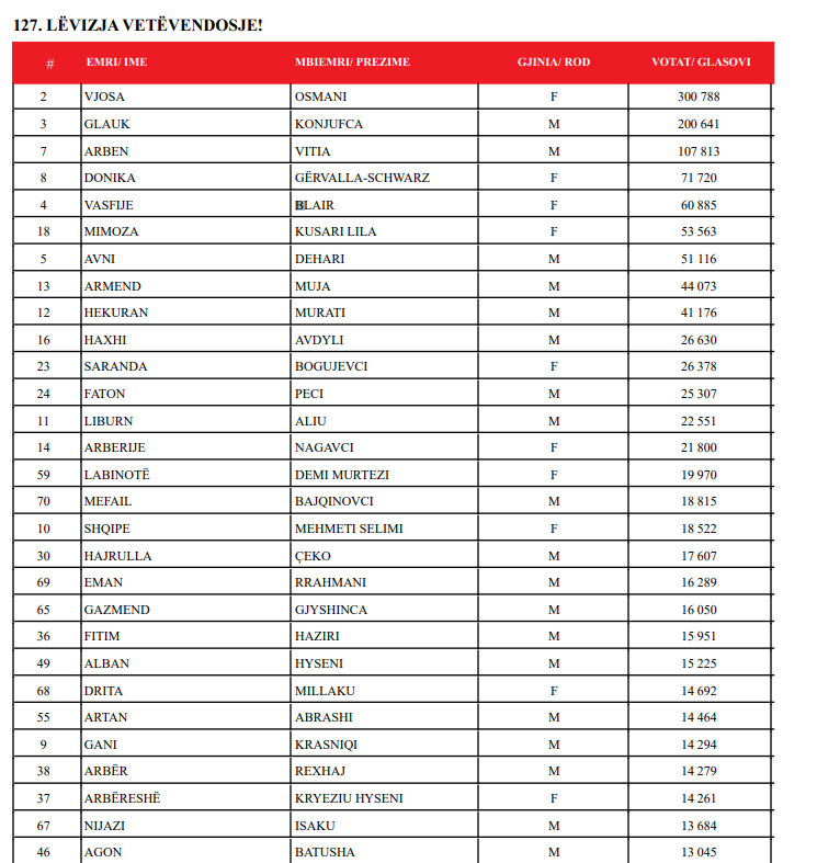 KQZ tashmë ka publikuar të dhënat përfundimtare të rezultateve për zgjedhjet e 14 shkurtit. Te Vetëvendosje, më e votuara është Vjosa Osmani me 300 mijë vota, ndërsa i fundit është Haki Abazi me 7 mijë e 600 vota.