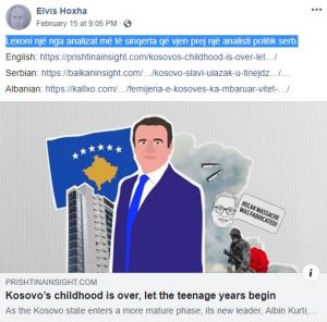 Po një deklaratë të një analisti serb e ka shpërndarë edhe Elvis Hoxha, tani më këshilltari i afërt i Albin Kurtit.