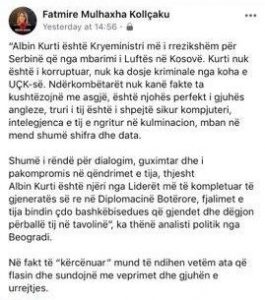 Një postim i deputetes Fatmire Kollçaku ku kishte shpërndarë një deklaratë të një analisti serb, nxiti shumë reagime.